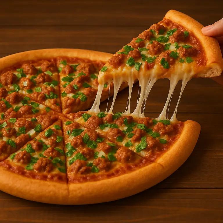 Salsa de tomate, Queso mozzarella, Pastor, Cebolla y Cilantro.