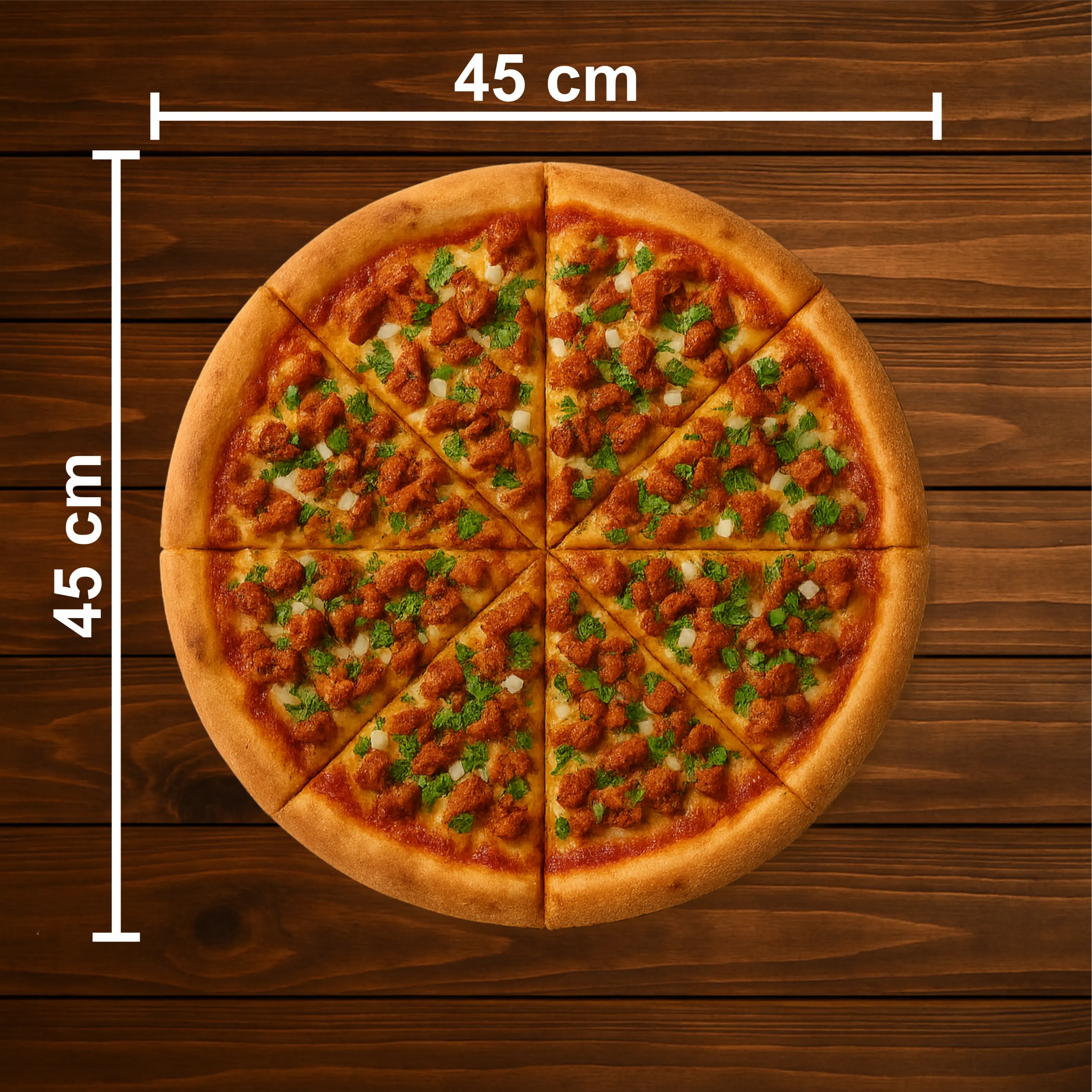 Salsa de tomate, Queso mozzarella, Pastor, Cebolla y Cilantro.