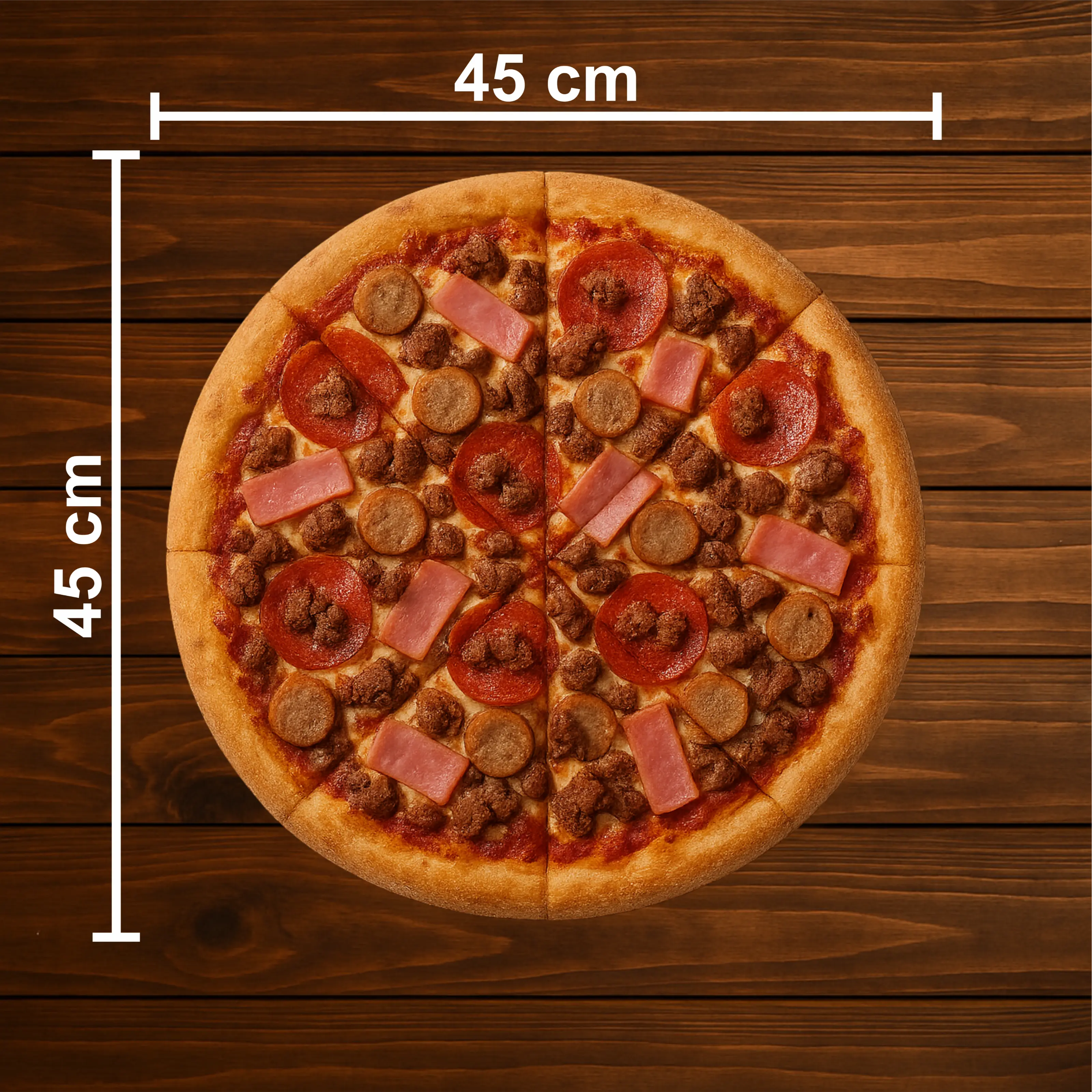 Salsa de tomate, Queso mozzarella, Jamón, Salchicha, Pepperoni y Bistec.