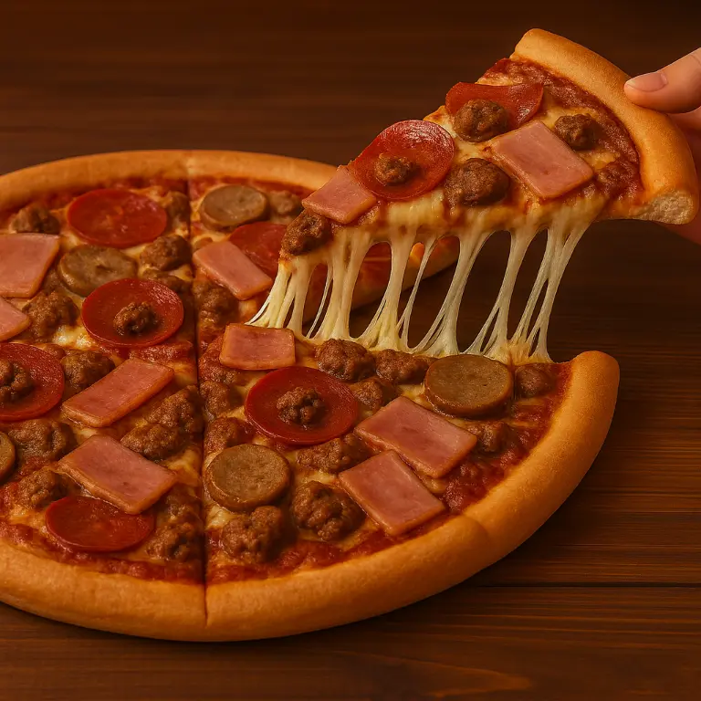 Salsa de tomate, Queso mozzarella, Jamón, Salchicha, Pepperoni y Bistec.
